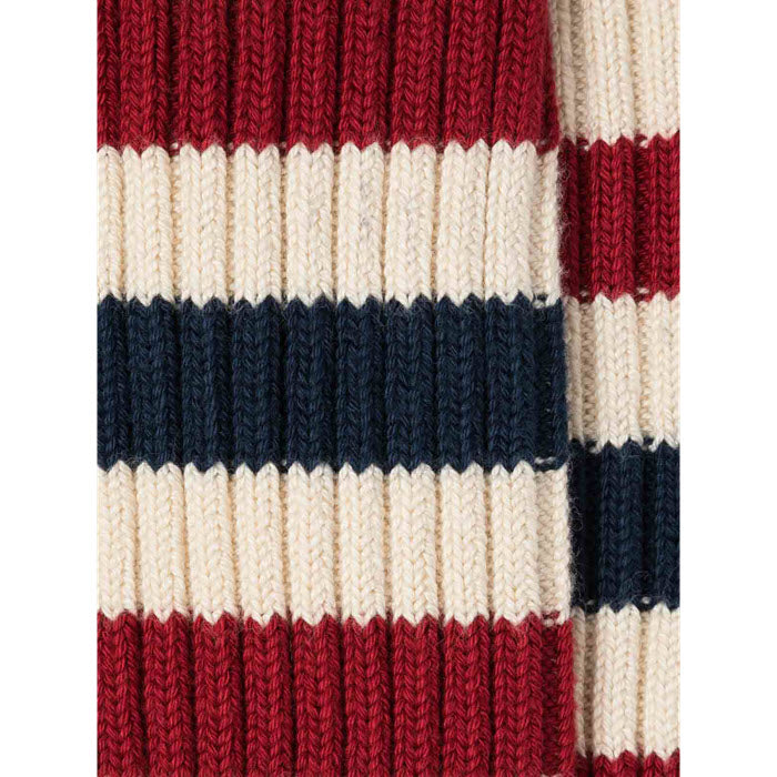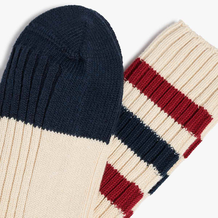 Diese dickeren, gerippten Socken aus Bio-Baumwolle haben einen lässigen, sportlichen Look und sind gleichzeitig eine luxuriöse Variante der Sportsocke. Ihre Dicke und die Qualität des weichen, luftigen Garns verleihen ihnen einen Vintage-Charme. Sie sind in Ecru mit Colorama-Streifen erhältlich.