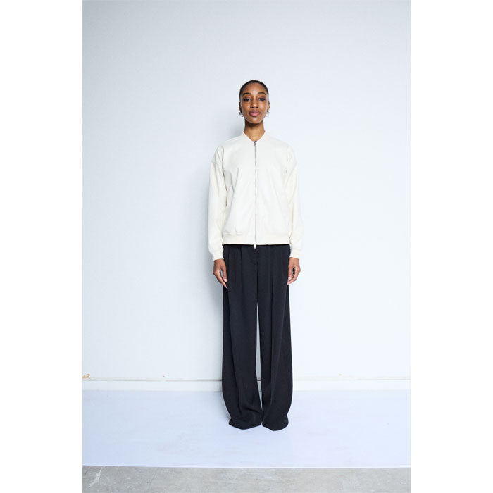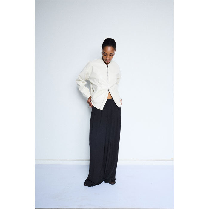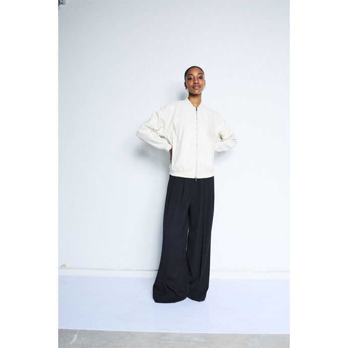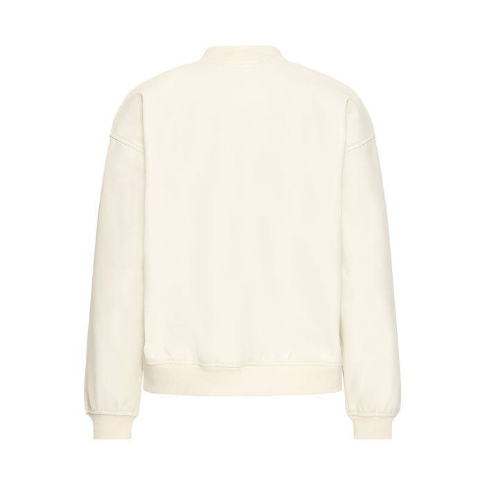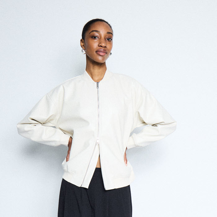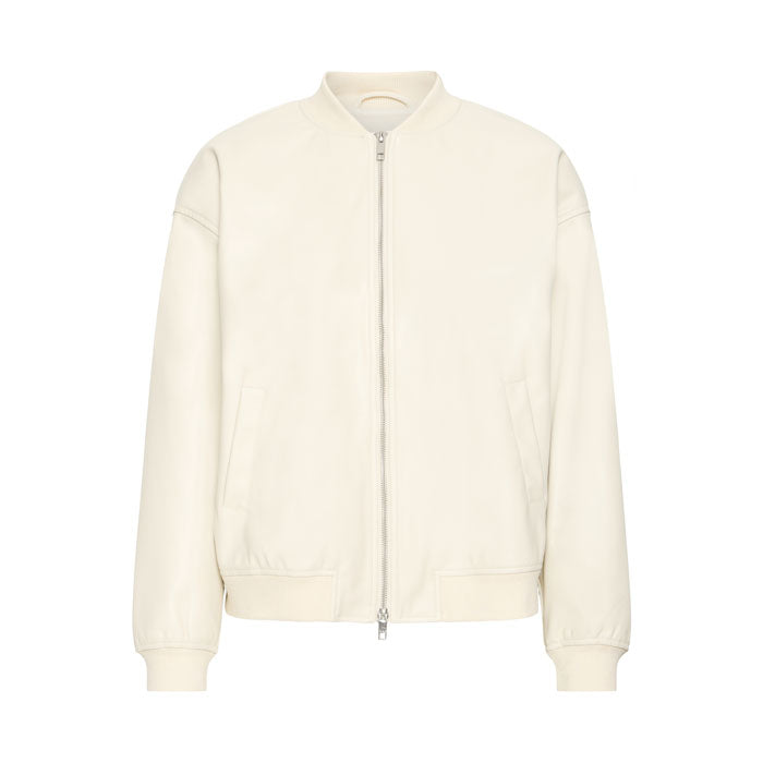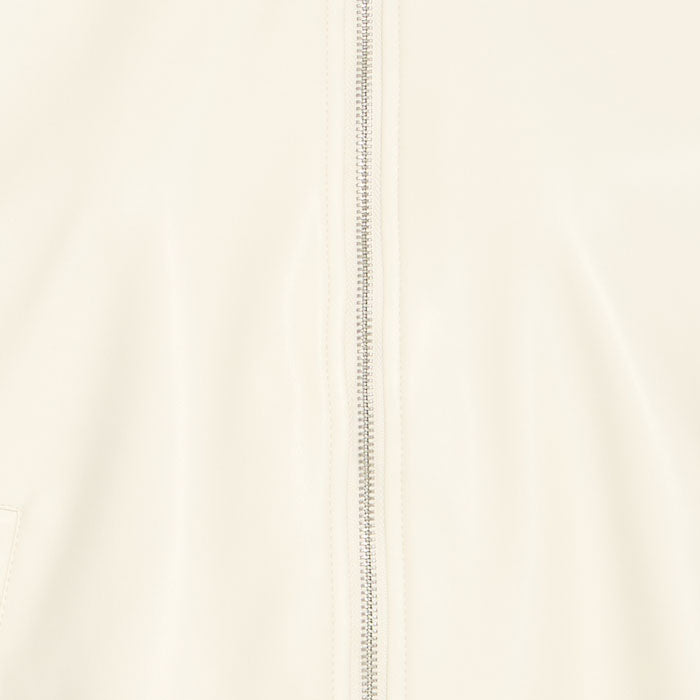 Die Jacke ist aus Kunstleder und die Farbe ist Eierschale.