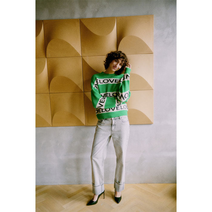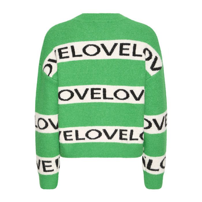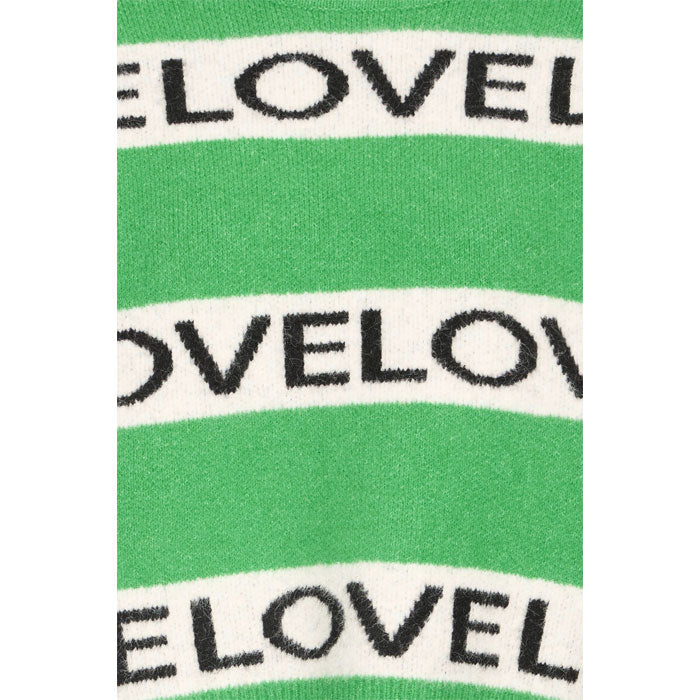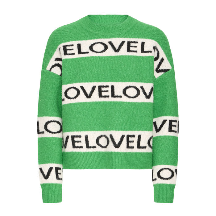 Der Pulli ist zweifarbig und hat im weissen Balken das wiederholende Wort "Love".